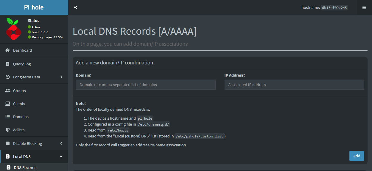 - Click on "Local DNS" > "DNS records" on the Pi-hole web UI.